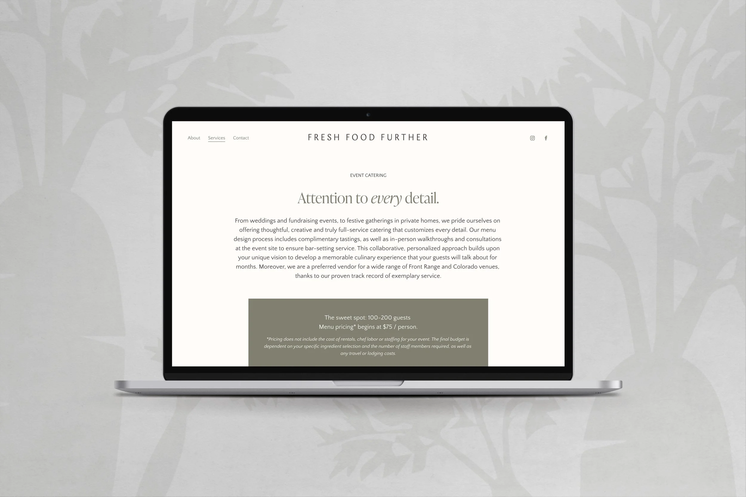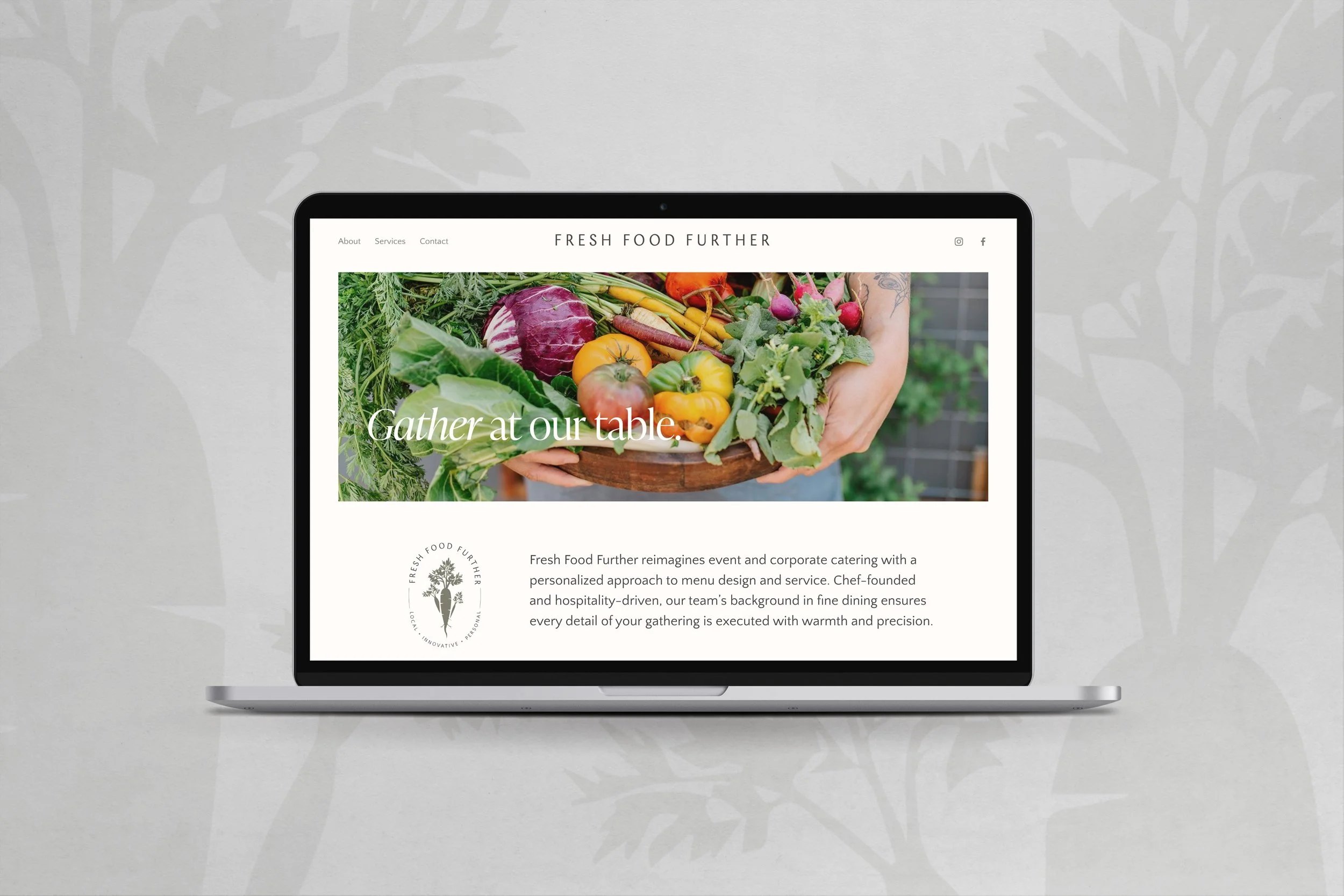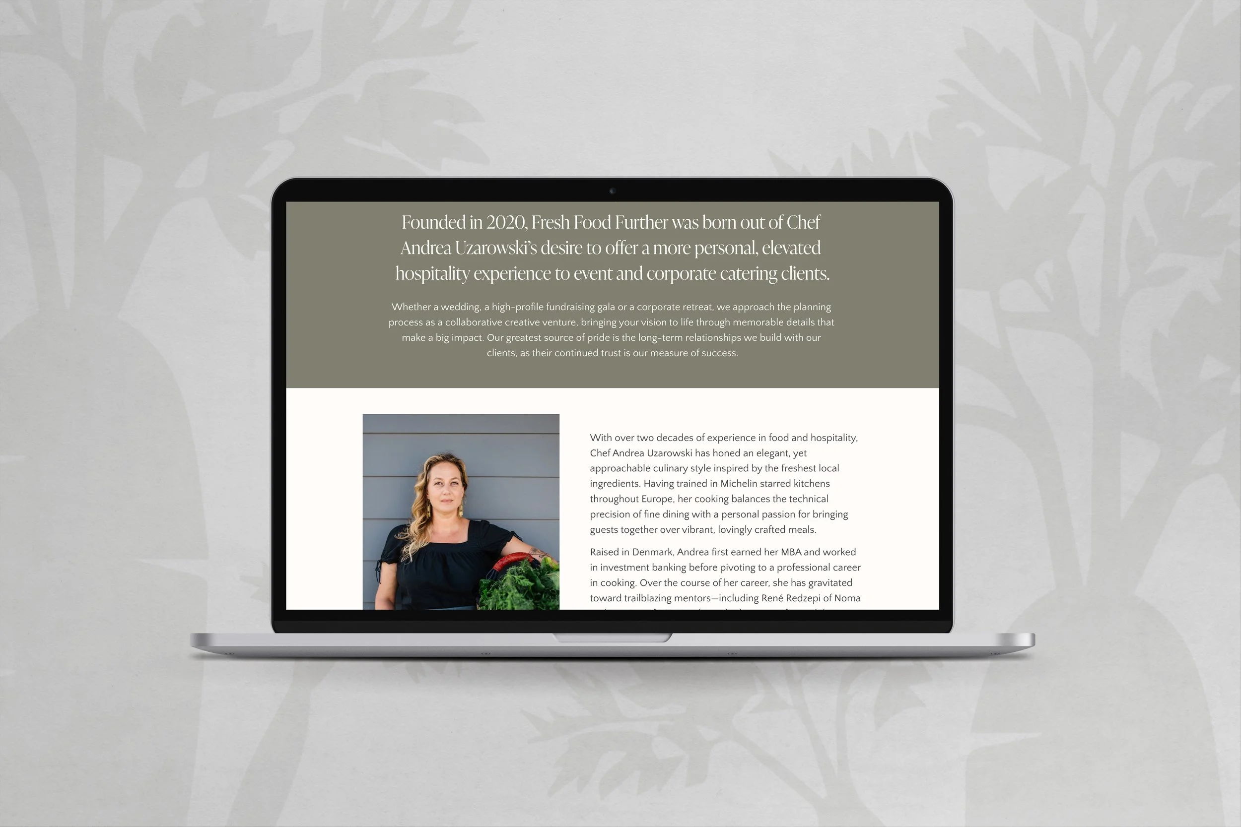 Despite launching during the Covid pandemic, Fresh Food Further had quickly gained a dedicated following of high net worth individuals, as well as corporate and wedding clients, leaving Chef Andrea little time to focus on updating her website or brand messaging as the business expanded. Yet at the same time, her online presence was holding the business back, as it did little to market her impressive credentials or differentiate her services from other caterers. In turn, we undertook a holistic brand refresh with the goal of ensuring that her online presence mirrors the quality of her in-person services.