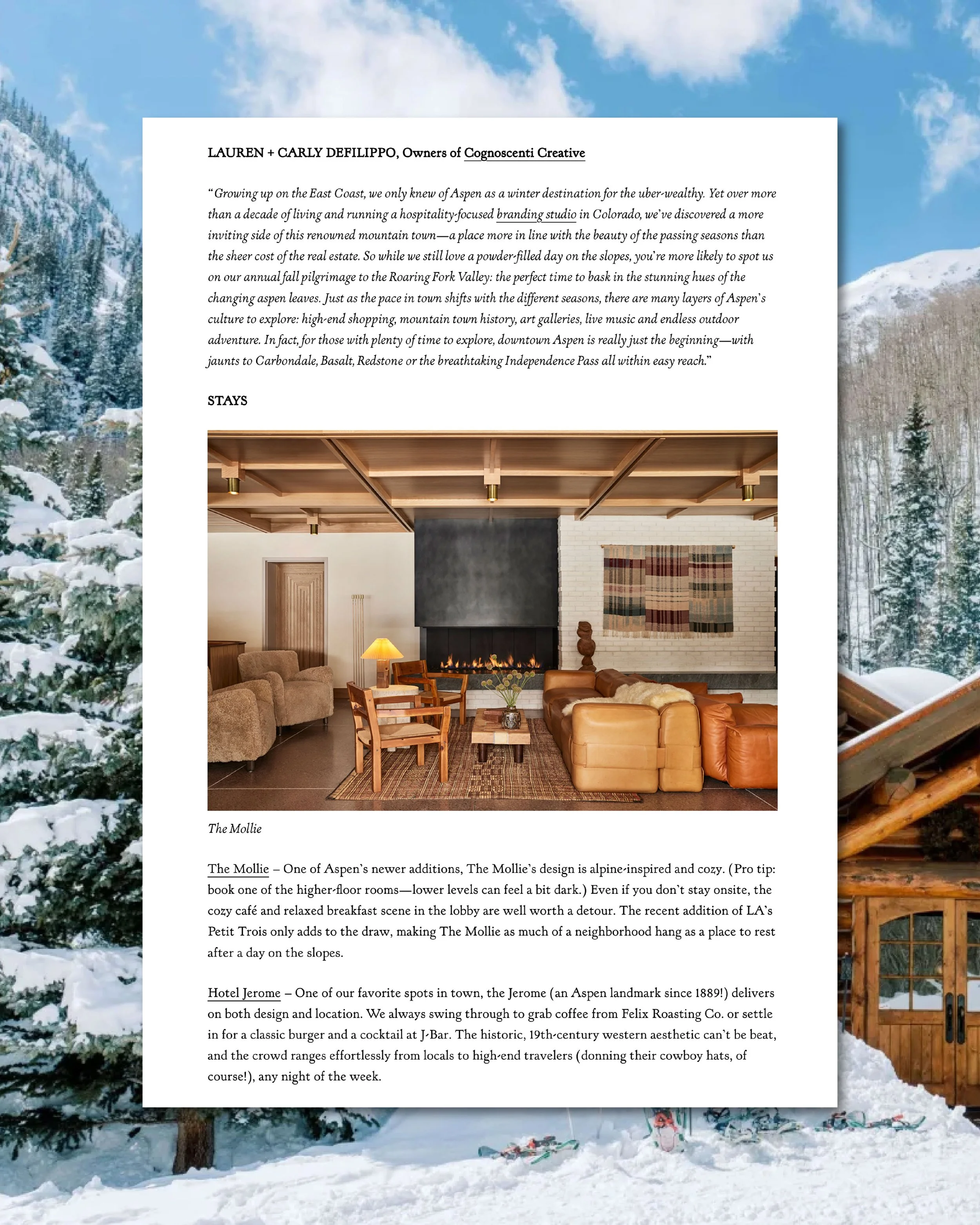 “Growing up on the East Coast, we only knew of Aspen as a winter destination for the uber-wealthy. Yet over more than a decade of living and running a hospitality-focused branding studio in Colorado, we’ve discovered a more inviting side of this renowned mountain town—a place more in line with the beauty of the passing seasons than the sheer cost of the real estate. So while we still love a powder-filled day on the slopes, you’re more likely to spot us on our annual fall pilgrimage to the Roaring Fork Valley: the perfect time to bask in the stunning hues of the changing aspen leaves…”