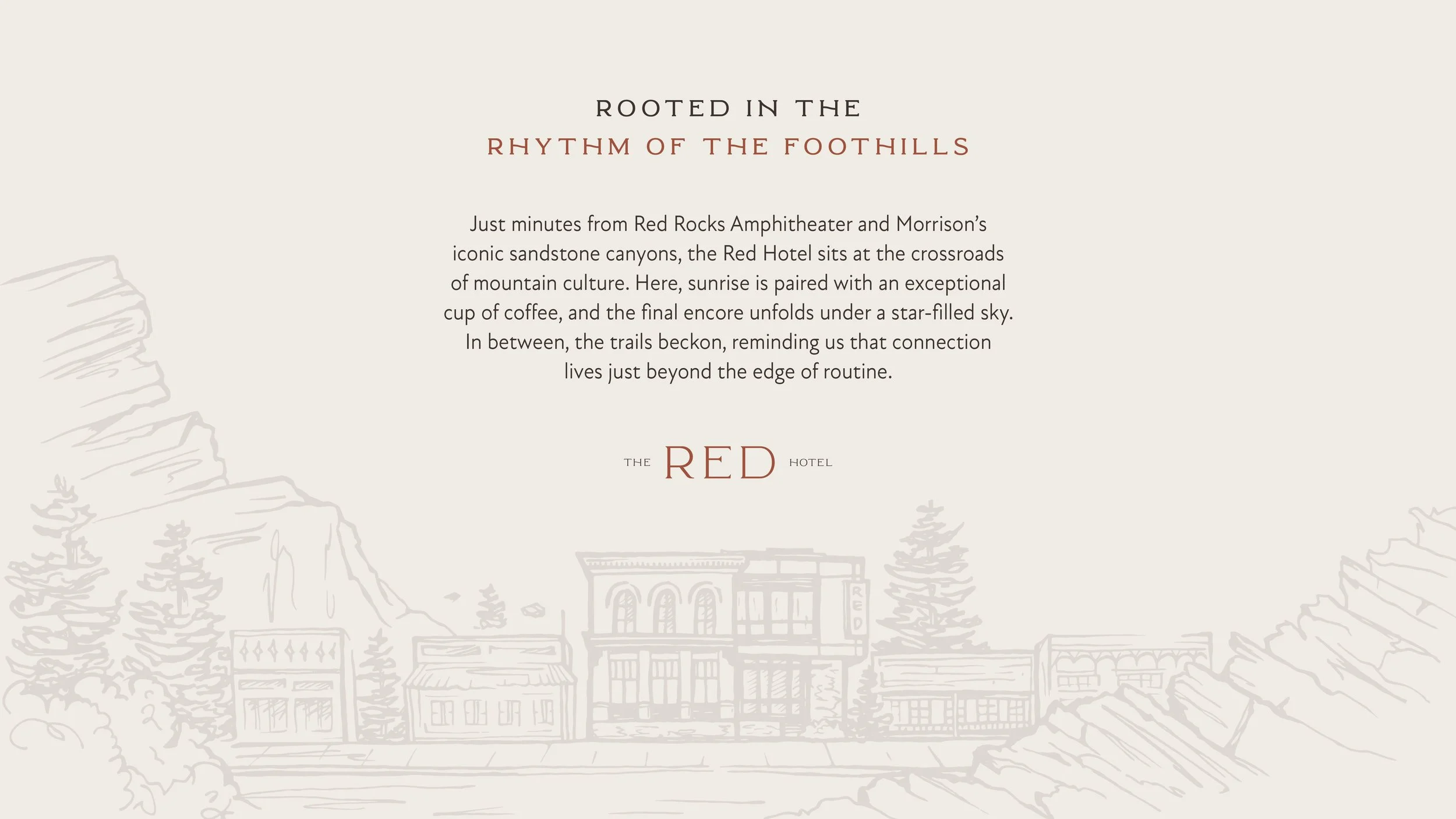 While the proximity to Red Rocks would always be a primary driver for this property, the team felt strongly about building a brand that offered more than just luxury and convenience. As a result, our copywriting focused on evoking the adventurous, yet grounded lifestyle of Morrison residents—inviting guests to take more than a passing interest in the landscape and community of the surrounding Foothills.